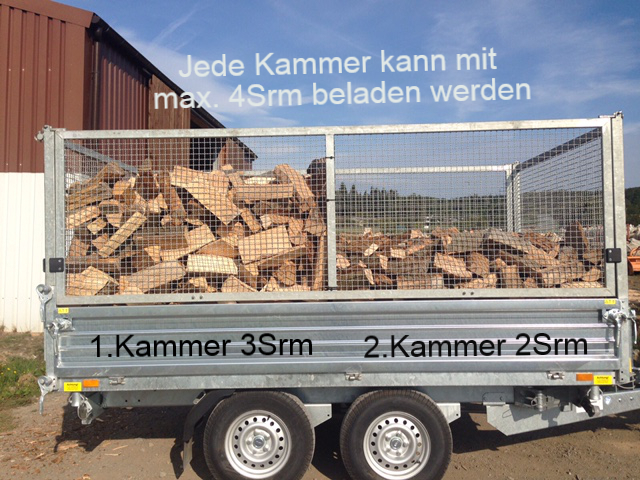 Bei einer Abnahme von einem Anhänger (8srm), der teilbar auf je 4srm pro Kammer ist, können Sie sich gerne auch einen Anhänger mit Ihrem Nachbarn teilen. Bei dieser Bestellung ist die Lieferung bei einfacher Strecke bis 25km ab Lager Eschbach kostenfrei.